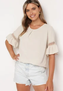 Beżowa Bluzka o Luźnym Kroju z Koronkowymi Wstawkami na Rękawach Lennera