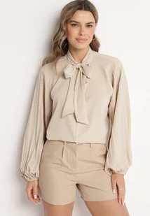 Beżowa Bluzka z Plisowanymi Rękawami i Wiązaniem pod Szyją Jenindria