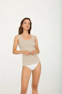 Klasyczna, kobieca koszulka na ramiączkach, w beżowym kolorze, to gwarancja wyjątkowej wygody i perfekcyjnego wyglądu. Zastosowanie technologii bezszwowej wp...