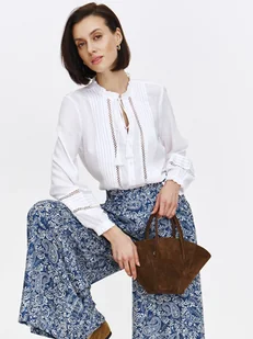 Bluzka damska Top Secret z eleganckim haftem. Elegancka bluzka damska z długim bufiastym rękawem, zakończonym ściągaczem oraz wzbogaconym o efektowne ażurowe wstawki. Dużego uroku dodaje jej kołnierzyk na marszczonej stójce wraz z wiązaniem z przodu, z wykorzystaniem tasiemki zakończonej frędzlami. Posiada ona zapięcie z przodu na guziki oraz subtelny haft w kilku miejscach, dodający całości delikatności oraz niebywałej kobiecości. Została ona uszyta z delikatnej oraz przewiewnej dzianiny wiskozowej, sprawdzając się doskonale zarówno jako element stroju do pracy, jak podczas uroczystej kolacji.