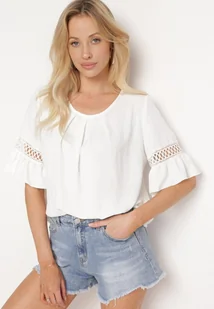 Biała Bluzka o Luźnym Kroju z Koronkowymi Wstawkami na Rękawach Lennera