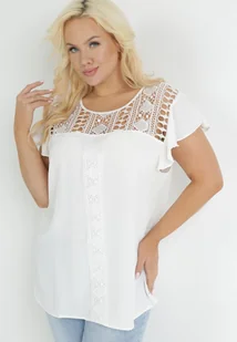 Biała Bluzka z Koronkowym Dekoltem i Falbankami Przy Ramionach Fistia