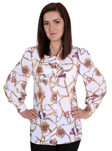 Biała koszula w modne, łańcuchowe wzory w złotym kolorze. Wykonana z delikatnego, lekkiego materiału, tył koszuli delikatnie dłuższy. Rękawy wykończone manki...