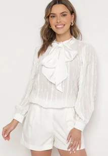 Biała Koszulowa Bluzka z Tłoczonej Tkaniny z Wiązaniem przy Dekolcie Sepiane
