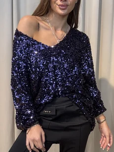 Cekinowa bluzka oversize z dekoltem V. Włoska produkcja. Rozmiar uniwersalny. Wymiary: Biust 160cm Długość 65/75cm Skład: 100% poliester 95% wiskoza 5% elas ...