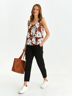 Bluzka damska Top Secret z efektownym nadrukiem. Ujmująca nietypowym krojem i pełnym wdzięku stylem bluzka damska bez rękawów na lekko szerszych ramiączkach. Uroku dodaje jej okazały okrągły dekolt i delikatnie odsłonięte plecy oraz marszczenie pośrodku ponad biustem. Została ona wykonana z bardzo dobrej jakościowo i przyjemnej w dotyku tkaniny wiskozowej, wzbogaconej na całości efektownym nadrukiem z motywem dużych polnych kwiatów. Jest ona szczególnie polecana kobietom ceniącym sobie własny styl.
