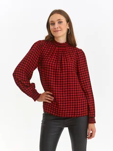 Bluzka damska Top Secret z kołnierzykiem na stójce. Urzekająca swym pełnym swobody stylem bluzka damska o luźnym kroju z prostymi długimi rękawami zakończonymi szerokim marszczeniem. Posiada ona efektowny kołnierzyk na marszczonej stójce, będąc zapinaną z tyłu na guziki. Uroku dodaje jej delikatne rozcięcie w postaci łezki na plecach oraz marszczenie z przodu ponad biustem. Wykonana ona została z miłej w dotyku tkaniny wiskozowej, wzbogaconej wzorem w kratę na całości.