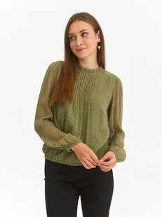 Bluzka damska Top Secret z marszczonym kołnierzykiem. Bluzka damska o luźnym kroju z prostym bufiastym rękawem zakończonym gumką. Posiada ona efektowny kołnierzyk na marszczonej stójce z zapięciem z tyłu na guziczek oraz ozdobnymi zaszewkami z przodu ponad biustem. Wykonana ona została z przyjemnej w dotyku oraz delikatnej dzianiny z ozdobną fakturą na całości oraz małymi ozdobnymi elementami. Uroku dodaje jej praktyczna gumka u jej dołu, sprawiając, iż dobrze komponuje się ona zarówno z klasycznymi długimi spodniami, jak i również ciekawą spódnicą.