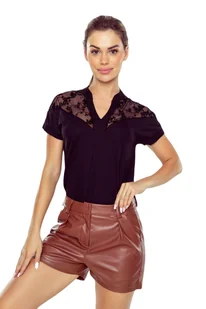 Dodatkowo, koronkowe wykończenia nadają całości kobiecego uroku, sprawiając, że bluzka jest wyjątkowym elementem każdej garderoby. Sefora to doskonały wybór dla kobiet, które cenią sobie elegancję, ale także poszukują wygodnego i stylowego ubrania na co dzień oraz na specjalne okazje. Kolor: czarny Skład surowcowy: 85% wiskoza, 10% poliamid, 5% elastan Szerokość w biuście(+/- 1cm): S-47, M-49, L-51, XL-53, 2XL-55, 3XL-57 Szerokość dołu(+/- 1cm):