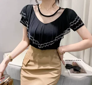 CECHY PRODUKTU: Bluzka damska Krótki rękaw Ozdobna falbanka Kryształki