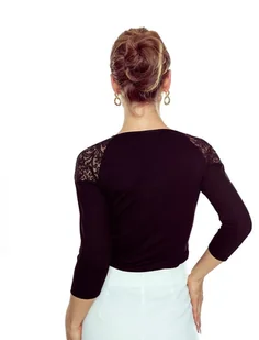 Bluzka damska z wiskozy z dużym koronkowym dekoltem. Rękaw 3/4. Skład: 85% wiskoza, 10% poliamid, 5%/ elastan.