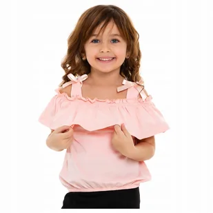 Śliczna bluzka z falbanką w morelowym odcieniu fason hiszpanka (z falbanką wokół dekoltu) na szerszych ramiączkach, ozdobionych satynowymi kokardkami dół wyk...
