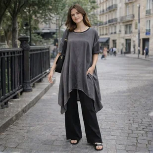 Bluzka Tunika damska Oversize Szara Grafit Asymetryczna Uniwersalna Bluzka Tunika Damska Oversize Szara Grafit Asymetryczna Uniwersalna Odkryj bluzkę, która przenosi pojęcie miejskiego minimalizmu na zupełnie nowy, stylowy poziom. To propozycja dla kobiet, które kochają nieszablonowe wzornictwo i chcą czuć się wyjątkowo nawet w najbardziej swobodnych stylizacjach. Model ten przyciąga wzrok surowym, nowoczesnym efektem sprania, który został finezyjnie wkomponowany w dynamiczny, asymetryczny fason w odcieniach głębokiego grafitu i antracytu. Wykonana z materiałów najwyższej jakości, zachwyca swoją trwałością i delikatnością. To idealny wybór dla osób poszukujących „casualowej awangardy” – świetnie zaprezentuje się zarówno w domowym zaciszu, jak i podczas weekendowych wyjazdów czy nieoficjalnych spotkań.