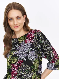 Bluzka damska Top Secret z efektownym nadrukiem w kwiaty. Urzekająca nienagannym stylem oraz pełnym luzu oraz swobody krojem bluzka damska z praktyczną szeroką gumką u jej dołu. Posiada ona rękawy o długości za łokieć wykończone delikatnym przeszyciem oraz okazały lekko owalny dekolt z lekko odsłoniętą górną częścią pleców. Wykonana ona została z przewiewnej oraz przyjemnej w dotyku tkaniny wiskozowej, będąc wzbogaconą o efektowny nadruk z motywem kwiatowym na całości. Dobrze wygląda ona zarówno w połączeniu z eleganckimi długimi spodniami, jak i również w stylizacji bardziej sportowej z jeansami.