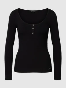 Bluzka z długim rękawem damska GUESS;Mieszanka wiskozy i elastanu;Dopasowany krój;Model ‘KARLEE’;Jednolity kolor;Dekolt w łódkę;Krótka listwa guzikowa;Detal z logo z obszyciem kamieniami stras;Długość tyłu w rozmiarze S: 57 cm