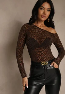 Brązowa Bluzka Longsleeve z Koronki z Asymetrycznym Dekoltem Liwedisa