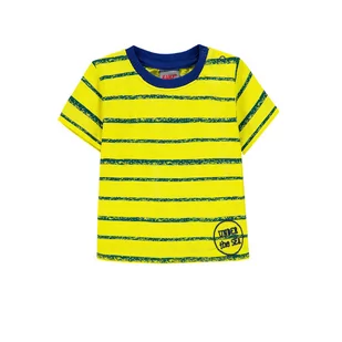 Chłopięca bluzka z krótkim rękawem w kolorze żółtym w ciemnoniebieskie paski. w lewym dolnym rogu znajduje się nadruk. ściągacz wokół szyi z dwoma zatrzaskam...