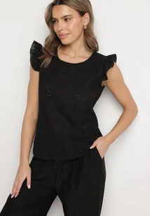 Czarna Bawełniana Bluzka Ozdobiona Ażurowym Wzorem i Falbankami Ridiruna
