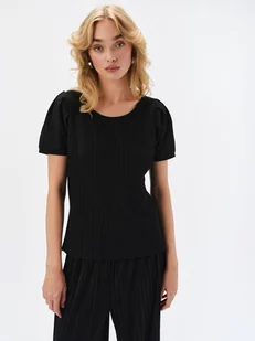 Czarna bluzka z bufiastym rękawem to elegancki element garderoby, idealny na wiele okazji. Wyróżnia się modnym fasonem, który łączy klasykę z nowoczesnymi trendami. Bufiaste rękawy dodają jej stylu i tworzą atrakcyjną sylwetkę. Doskonale sprawdzi się zarówno w codziennych stylizacjach, jak i podczas bardziej formalnych wyjść. Wykonana z wysokiej jakości materiału, gwarantuje komfort noszenia przez cały dzień.