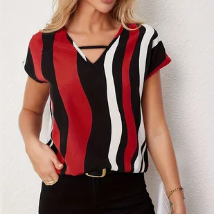 CECHY PRODUKTU: Damska bluzka Krótki rękaw Dekolt w serek Wzór w pasy 3 kolory