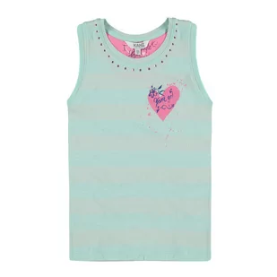Dziewczęca bluzka na szerokich ramiączkach w kolorze jasno niebieskim z aplikacją - serduszko. Pod szyją bluzka wykończona jest świecącymi kamykami co nadaje...