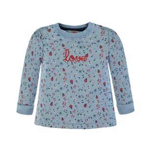 Dziewczęca bluzka z długim rękawem w niebieskim kolorze z bardzo dziewczęcą aplikacją na całej bluzeczce przedstawiającej kwiatuszki i naszytym napisie „love...