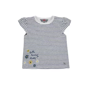 Dziewczęca bluzka z rękawkiem w stylu motylków, czyli zakryte ramionka i wycięte pod paszką. Bluzka jest w ciemno niebieskie paski i z pewnością sprawdzi s...