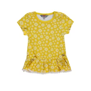 Dziewczęca bluzka z krótkim rękawem w kolorze żółtym w białe margaretki. Bluzka jest zapinana na napę z boku , posiada również odcięcie w postaci falbanki u ...