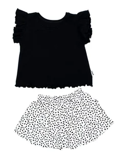 Stylowy letni komplet dla dziewczynki w ponadczasowej, neutralnej kolorystyce czerni i bieli. Wykonany w 100% z certyfikowanej bawełny – miękkiej, przewiewne...