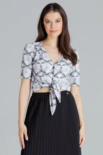 biustu100104108112ob. pasa100104108112szer. ramienia77,588,5szer. pleców34353637 Krótka wzorzysta koszulka o prostym kroju z dekoltem w serduszko. Zapinana z przodu na guziki, z ozdobnym wiązaniem u dołu koszulki.