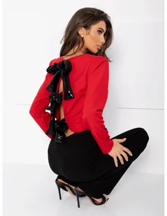 Elegancka bluzka z kokardami z tyłu LUNED - czerwona Elegancka bluzka LUNED to idealna propozycja dla kobiet, które cenią sobie nietuzinkowe rozwiązania i wyjątkowy styl. Wyróżnia się trzema cekinowymi kokardami z tyłu, które tworzą efektowny akcent i dodają bluzce niepowtarzalnego charakteru. Poduszki na ramionach podkreślają jej elegancki krój, a zaszewki na biuście zapewniają idealne dopasowanie. Długi rękaw dodaje klasy i sprawia, że bluzka świetnie sprawdzi się na chłodniejsze dni. Zestaw bluzkę z dopasowanymi czarnymi spodniami i klasycznymi szpilkami, tworząc szykowny, a zarazem oryginalny look.