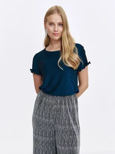 Bluzka damska Top Secret z ozdobnymi falbankami. Bluzka damska o luźnym kroju z okrągłym dekoltem wykończonym delikatną lamówką wokół. Posiada ona krótkie rękawy, u których zwieńczenia umiejscowiono ozdobną falbankę. Wykonana ona została z przyjemnej w dotyku oraz delikatnej dzianiny z dodatkiem metalizowanej nitki, dzięki czemu efektownie połyskuje ona na całości. Będzie ona doskonałym uzupełnieniem zarówno eleganckiej stylizacji do pracy, jak i również niecodziennej kreacji imprezowej. Bluzka damska dostępna w kolorze turkusowym TSKW24TOP631865X00. Modelka ma 177 cm wzrostu prezentuje rozmiar 34.