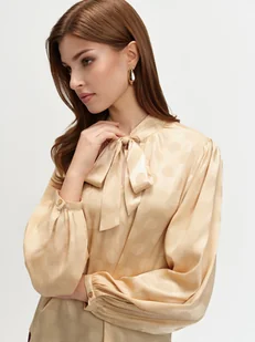Elegancka bluzka z wiązaniem przy dekolcie to idealny wybór do eleganckich stylizacji. Model prezentuje beżowy kolor z delikatnymi wzorami, nadając jej subtelnego szyku. Luźny krój oraz długie rękawy dodają jej wdzięku i komfortu noszenia. Wiązanie można modyfikować pod swoje preferencje np. w kokardę.