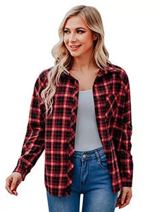 Irevial Damska koszula w kratkę, długi rękaw, elegancka bluzka w stylu miejskim, bluzka koszulowa, na co dzień, stójka, z kieszeniami, guzikami, bluzka, tunika, czerwony + czarny, M
