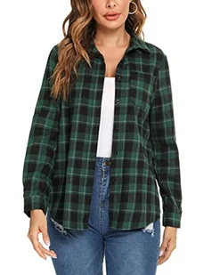 Irevial Długa bluzka damska oversize, koszula bawełniana, guziki, koszulka z długim rękawem, luźna, na czas wolny, koszula koszulowa, Zielony + czarny-2, S