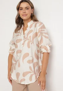 Jasnobeżowa Koszulowa Bluzka z Wiskozy w Roślinny Wzór z Dekoltem w Serek Koladoretia