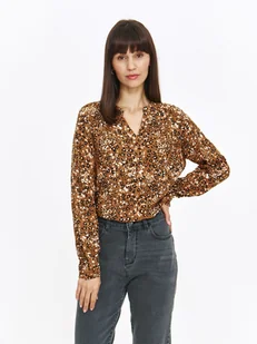 Koszula damska Top Secret z barwnym drobnym nadrukiem. Ujmująca swym niecodziennym stylem oraz dużą wygodą podczas użytkowania, koszula damska z prostym długim rękawem zakończonym mankietem z zapięciem na guzik. Posiada ona dekolt w kształcie litery V wraz z kołnierzykiem na delikatnej stójce oraz zapięciem z przodu poniżej dekoltu na trzy małe guziczki. Uroku dodaje jej wykonanie z delikatnej oraz przyjemnej w dotyku dzianiny wiskozowej, wzbogaconej na całości efektownym barwnym nadrukiem z motywem roślinnym. Świetnie prezentuje się ona zestawiona zarówno jako element klasycznej stylizacji do pracy, jak i również podczas weekendowych spotkań w gronie przyjaciół.
