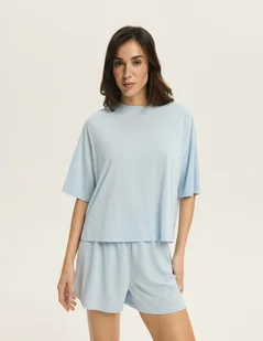 Koszulka damska Ruth Esotiq w odcieniu jasno-niebieskim to połączenie prostoty i komfortu. Wykonana z mieszanki modalu i poliestru, gwarantuje przyjemność no...