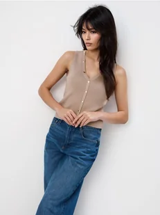 Dzianinowa bluzka bez rękawów, z dekoltem V i ozdobnymi guzikami.