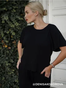 Dzianinowa bluzka z okrągłym dekoltem oraz krótkim rękawem z falbanką. Uszyta w 65% z wiskozy.
