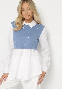 Niebieska Rozkloszowana Bluzka Koszulowa z Wiskozą z Wszytą Kamizelką z Cyrkoniami Uliaviela