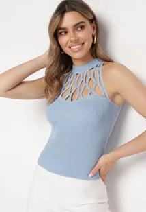Niebieski Top z Prążkowanej Dzianiny z Ażurowym Dekoltem Hiba