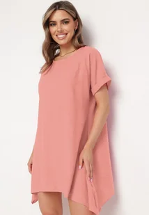 Różowa Tunika Sukienka z Krótkim Rękawem i Asymetrycznym Dołem Fianda