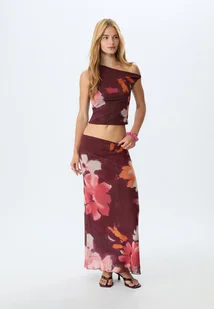 Stradivarius Asymetryczna koszulka z tiulu we wzory Fioletowy XL