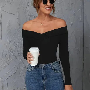 TEMU 1 szt. Elegancka bluzka damska z odkrytymi ramionami i długim rękawem, z jednokolorowej dzianiny poliestrowej, uniwersalna bluzka na każdą porę