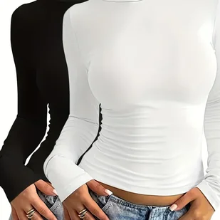 TEMU 2 szt. Eleganckie Damskie Bluzki z Długim Rękawem - Miękkie, Elastyczne Bluzy z Okrągłym Dekoltem, Jednokolorowe Koszule Casual i Półformalne