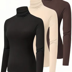 TEMU 3 szt., Damskie Bluzy z Długim Rękawem, Wysoki Kołnierz, , Dopasowane Topy