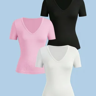 TEMU 3 szt. Damskie Bluzki z Dekoltem w Serek i Krótkim Rękawem – Jednokolorowe, Dopasowane w Kolorach Czarny/Biały/Różowy, Podstawowe i Uniwersalne