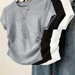 TEMU 3 szt. Damskie Casualowe Koszulki z Krótkim Rękawem i Falbankami, Okrągły Dekolt, Jednokolorowe, Slim Fit