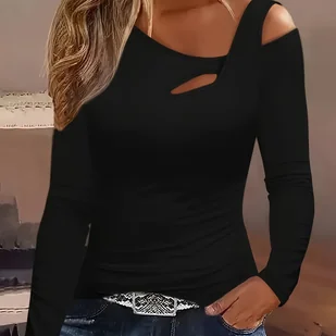 TEMU Asymetryczna Koszulka z Jednym Ramieniem - Czarna Bluzka z Długim Rękawem, Luźny Fason z Asymetrycznym Dołem i Odkrytym Ramieniem, Jednokolorowa
